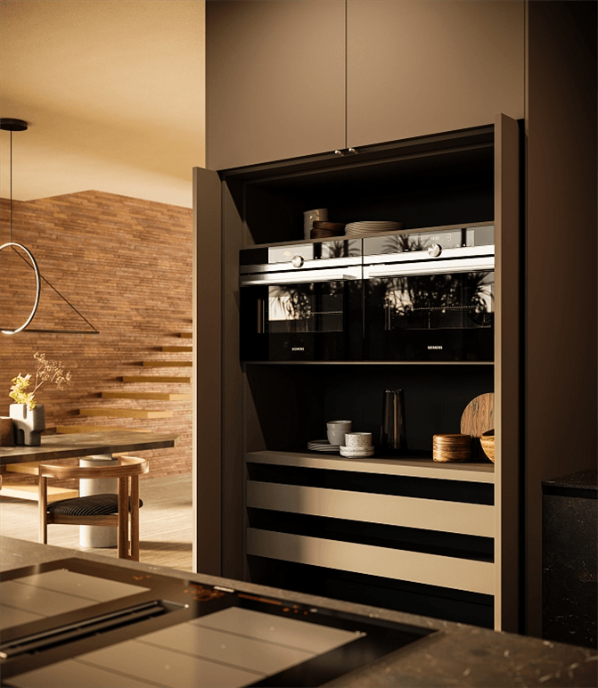 Plinth and handleless groove are matt lacquered to match the tall units.