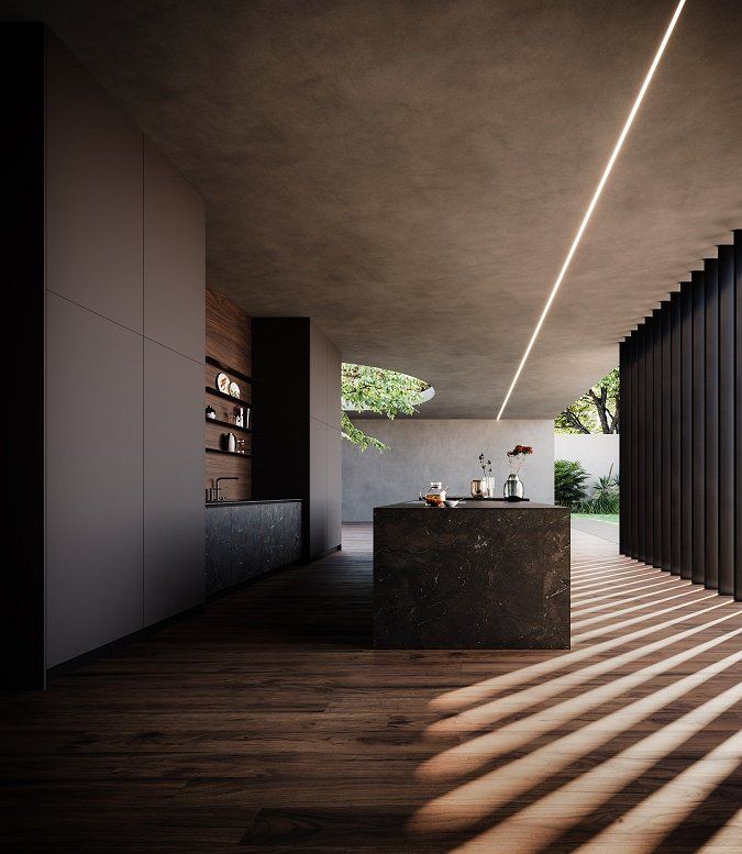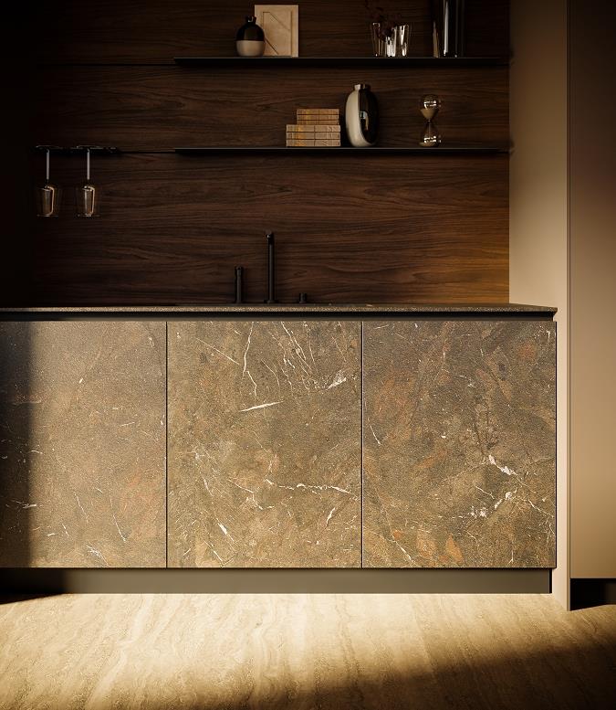 This ideal and romantic subdivision of elements designed by Tellatin also allows the kitchen to feature two additional key elements: earth and air. The former represented by the boiserie pantry that frames the two islands, and the latter embodied by the idea that this open composition - due to the elegance and materials used to manufacture it - can communicate directly with the rest of the house and in particular with the living room. The materials are particularly refined and unusual, featuring Tiffany quartzite, a metamorphic rock characterized by green veins that turn to blue and heat-treated Oak wood. In addition, the special powder coating for the aluminium doors, with its delicate and silky effect, hides perfect resistance and durability.